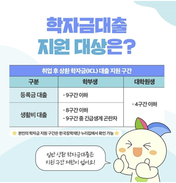 | 📌 취업 후 상환 학자금대출 | 학자금 지원구간 조건 필수 ❗ - 학부생: 9구간 이하 (생활비는 8구간 이하) - 대학원생: 4구간 이하 (생활비 및 등록금 동일 조건) |